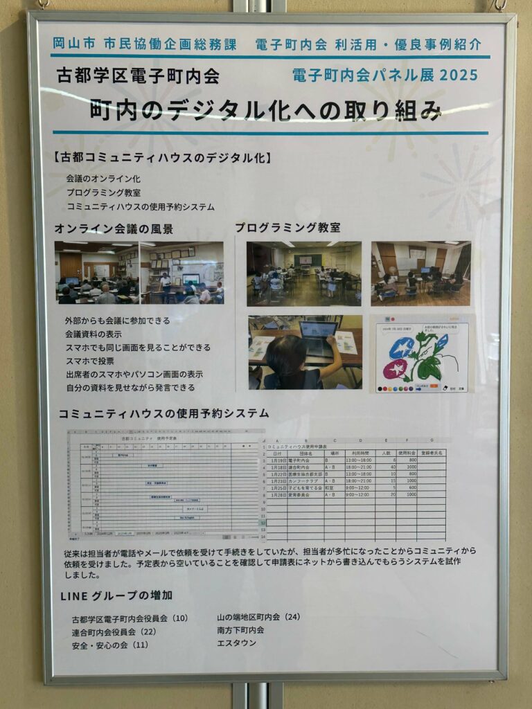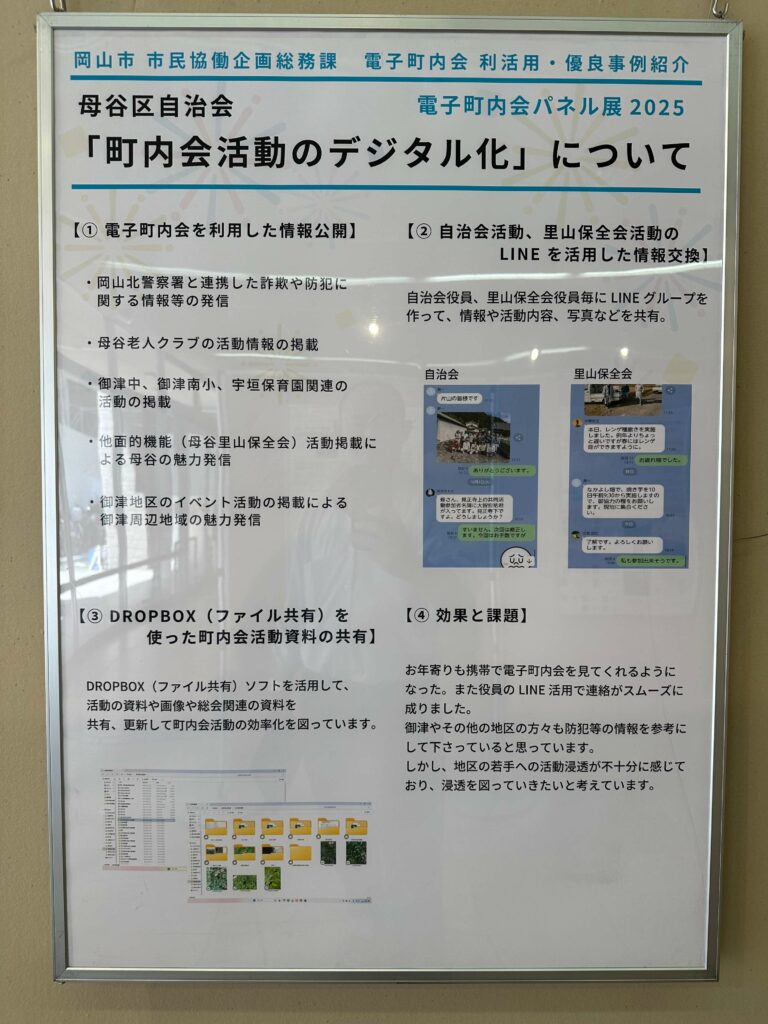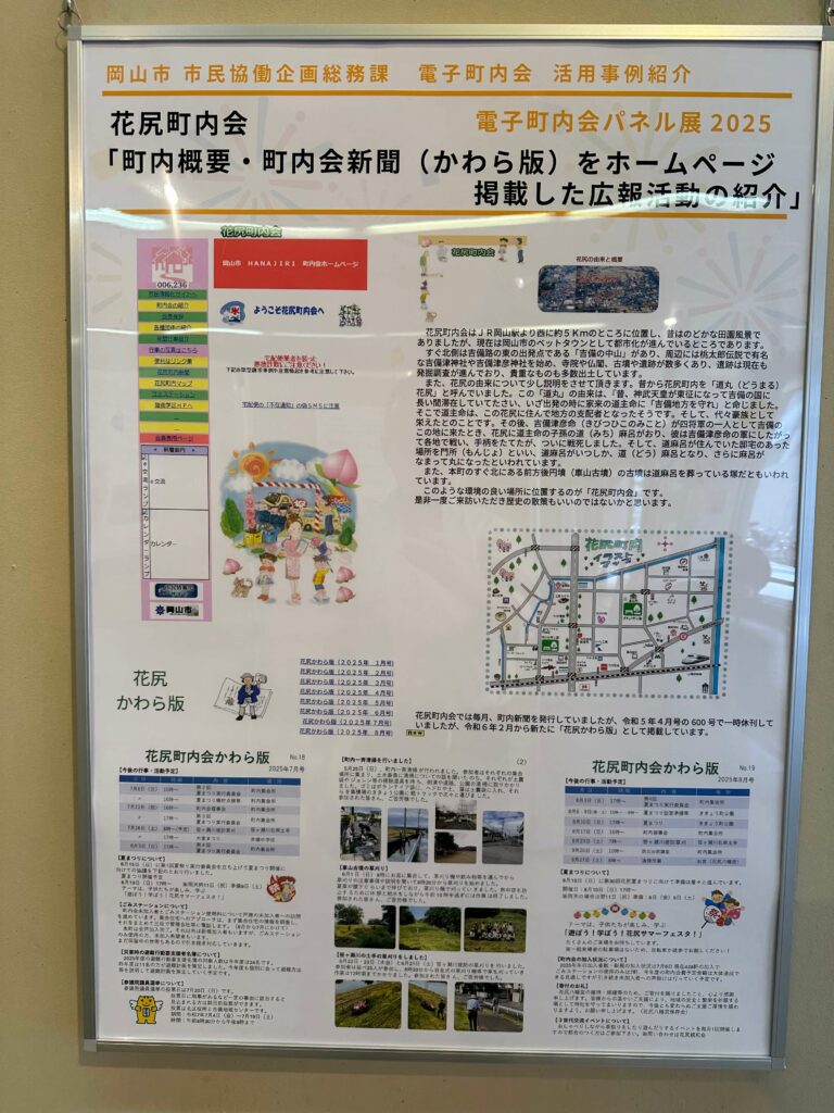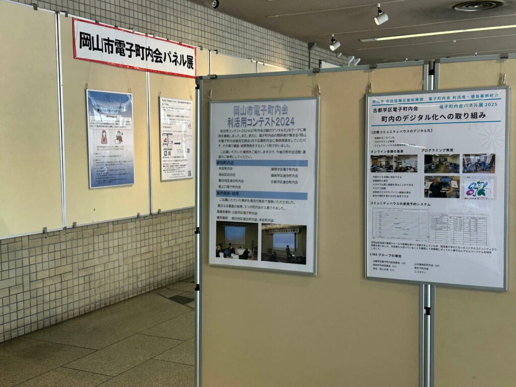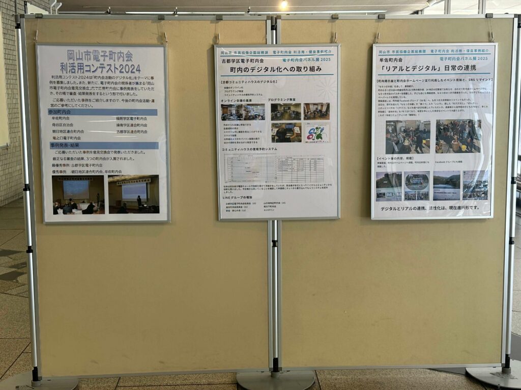 令和7年度 電子町内会パネル展が開催されました 平素より電子町内会の活動にご尽力いただき、ありがとうございます。令和7年度 電子町内会パネル展が、令和7年8月28日(木)、29日(金)の2日間、岡山市役所本庁舎1階 市民ホールにて開催されました。 令和6年度 利活用コンテストの参加作品も展示 参加町内会からのオリジナル作品も展示