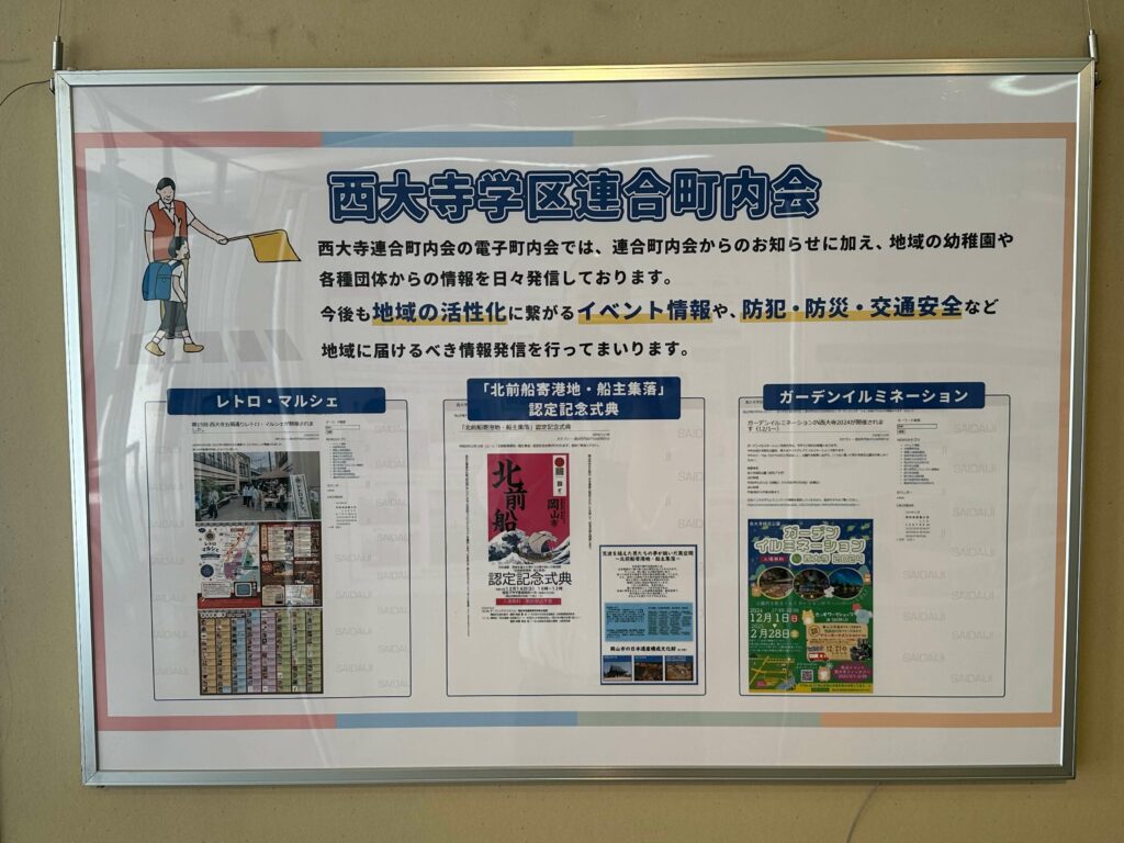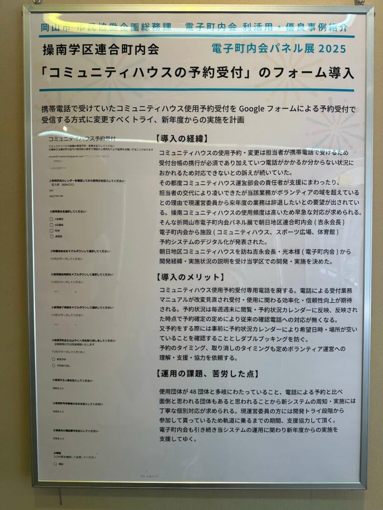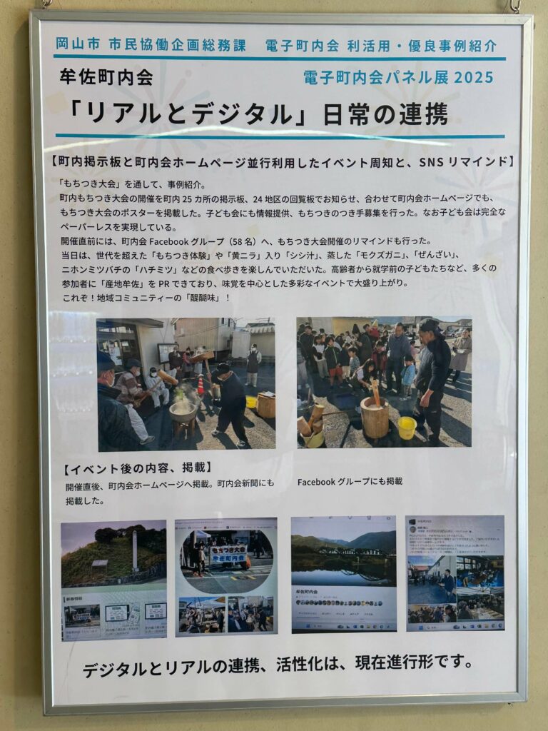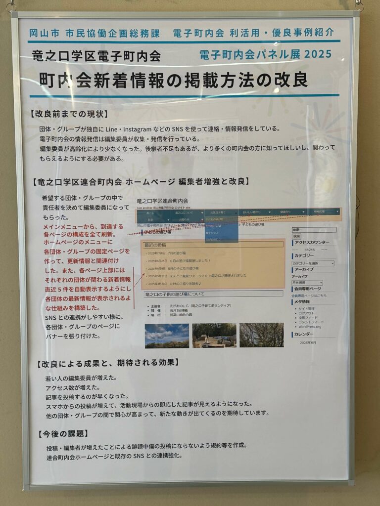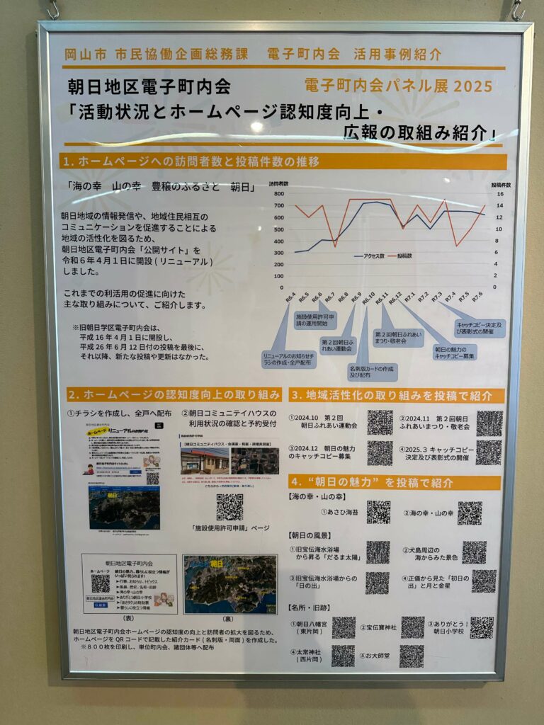 令和7年度 電子町内会パネル展が開催されました 平素より電子町内会の活動にご尽力いただき、ありがとうございます。令和7年度 電子町内会パネル展が、令和7年8月28日(木)、29日(金)の2日間、岡山市役所本庁舎1階 市民ホールにて開催されました。 令和6年度 利活用コンテストの参加作品も展示 参加町内会からのオリジナル作品も展示