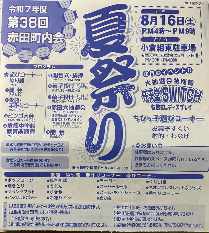第38回赤田町内会夏祭りを開催しました。夏祭りは16時に始まりましたが、20時の抽選会開始と同時に激しい雨に見舞われてしまいました。それでも参加者たちは最後まで抽選の行方に一喜一憂しながら、当選者の発表を見守りました。そして、今年も竜操中学校他の生徒さんに、ボランティアとして夜店を手伝って頂きましたので大変助かりました。さらに竜操中学校吹奏楽部の演奏もあり、多くの方が参加されました。主なイベントとしては、ビンゴ大会に始まり、小学生への菓子投げ、大抽選会を行いました。開催案内(チラシ)はコチラへ※夏祭りをスタートさせて今年で41年目となりました。コロナ期間中は、やむを得ず開催することができませんでしたが、それ以外は雨による中止も一度もなく毎年続けて参りました。これは、ひとえに町内会の皆様のご協力があっての成果ですので御礼申し上げます。今後も皆様が楽しめる夏祭りを開催していきますので宜しくお願いします。[町内会長(市 圭子)]