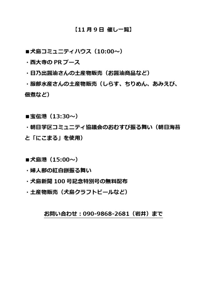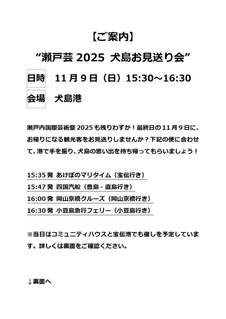瀬戸芸2025 犬島お見送り会 投稿日:2025年11月4日 『瀬戸内国際芸術祭』秋会期最終日 11月9日(日)に、観光客に感謝の意を込めて、お見送り会を実施します。場所は犬島と宝伝の2会場。犬島では犬島婦人部が紅白餅を、宝伝では朝日学区コミュニティ協議会がおにぎりを振る舞います。お時間が許す限り、会場に足をお運びくださいませ。 概要は以下(犬島で回覧中の案内)の通り カテゴリー:お知らせ 犬島町内会