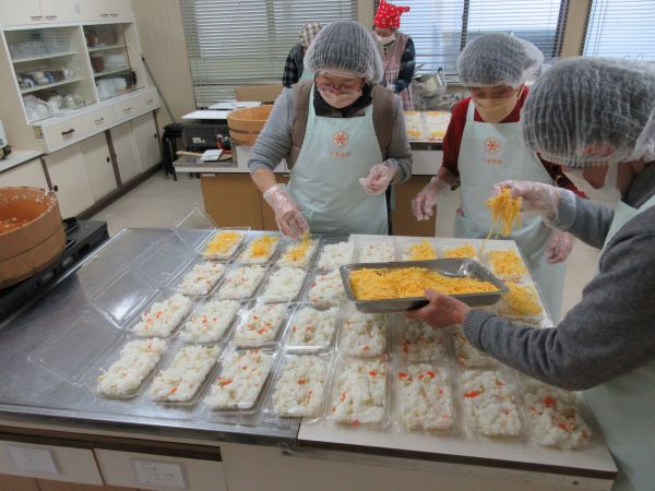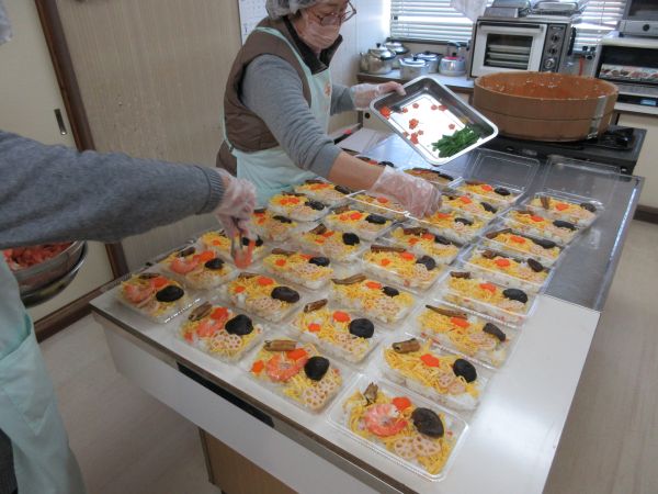 当日は、朝日地区栄養改善協議会のメンバーが朝日コミュニティハウス調理室で「祭寿司弁当」を調理し、町内会役員も協力して52世帯へ配食しました。受け取られた皆さんは喜んでおられ、感謝の言葉をいただきました。