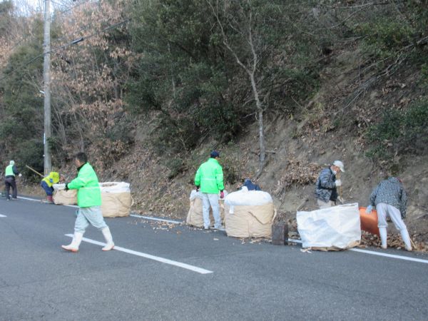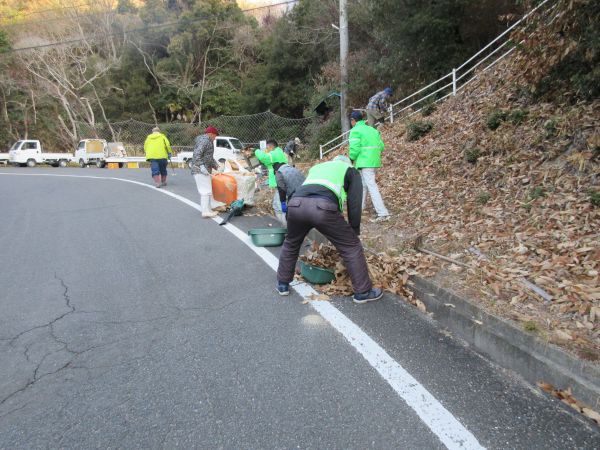 1月31日(土)の午前、宝伝町内の有志が県道232号線の宝伝坂の側溝に溜まった落ち葉などの除去と防犯灯の照明を遮る樹木の剪定を行いました。側溝の300mほどの間へは毎年たくさんの落ち葉が溜まり、降雨量が多いと落ち葉や泥が道路に溢れて危険な状態になるため除去作業を行っています。