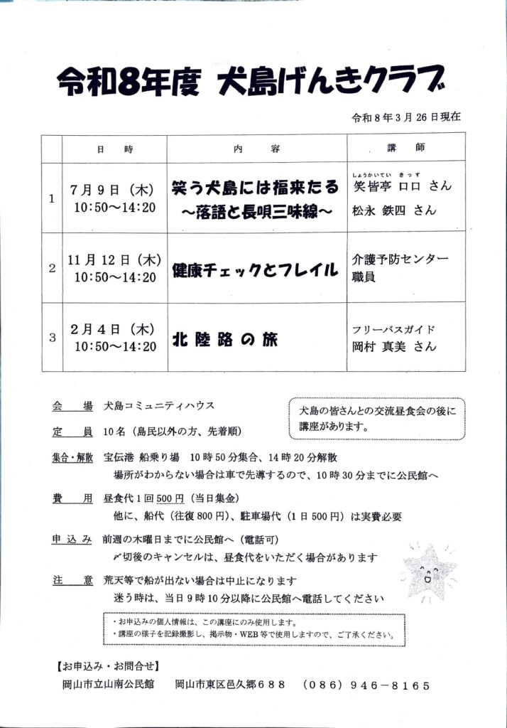 令和8年度 犬島げんきクラブのお知らせ