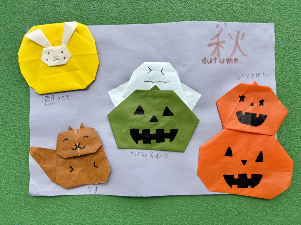 10月の掲示板① 2025.10.01 新着情報 10月に入り、朝夕はようやく過ごしやすくなってまいりました。 「秋」をテーマにした、お子さんの作品を掲示しています。秋はお月見、ハロウィンなど様々なイベントがありますね。季節感のある、可愛らしい作品をありがとうございます。 「満月うさぎ」は1枚の折り紙で折られているようで、驚きました!