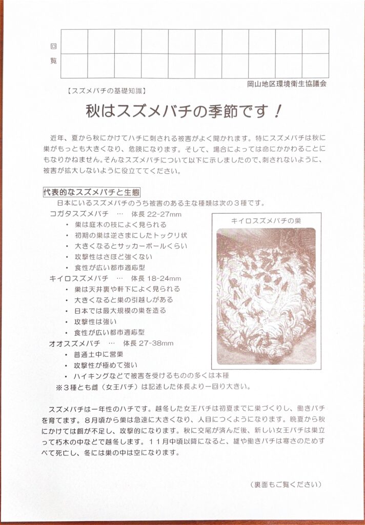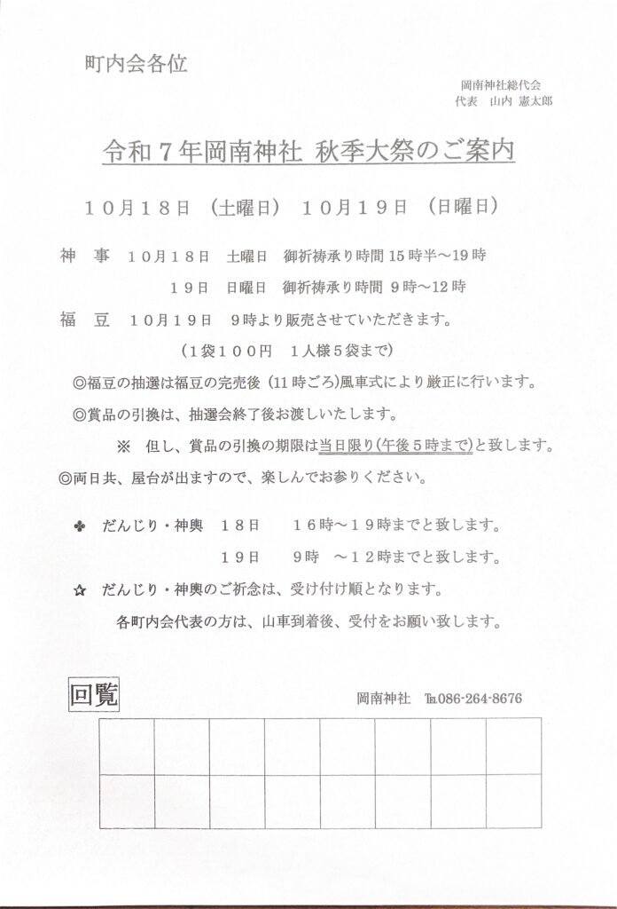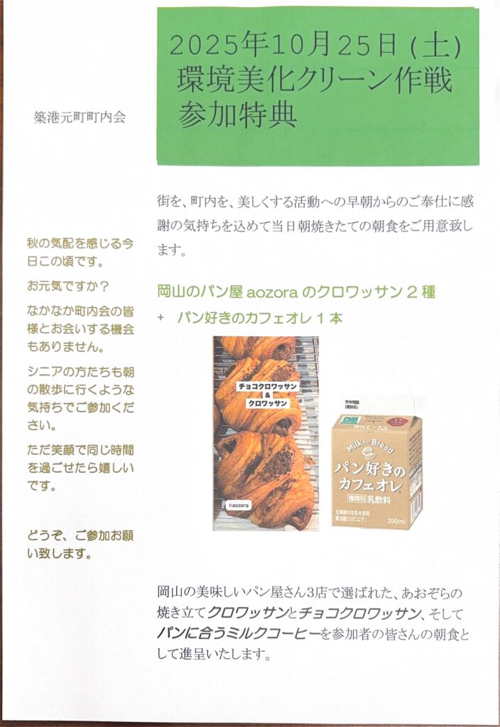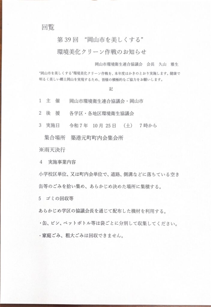 2025年10月3日発回覧板 2025.10.03 回覧板 新着情報 ①環境美化クリーン作戦のお知らせ 10月25日(土)7時〜約30分程度、環境美化クリーン作戦を行います。皆様、ぜひご参加ください。 【訂正事項】参加特典に変更がございます。「aozora」のクロワッサン2種→「かおりほのか」のクロワッサン1個、さつま芋のパン1個へ変更になりました。ご了承いただけますようお願いします。 ②岡南神社秋季大祭のご案内 ③岡山地区環境衛生協議会のご案内
