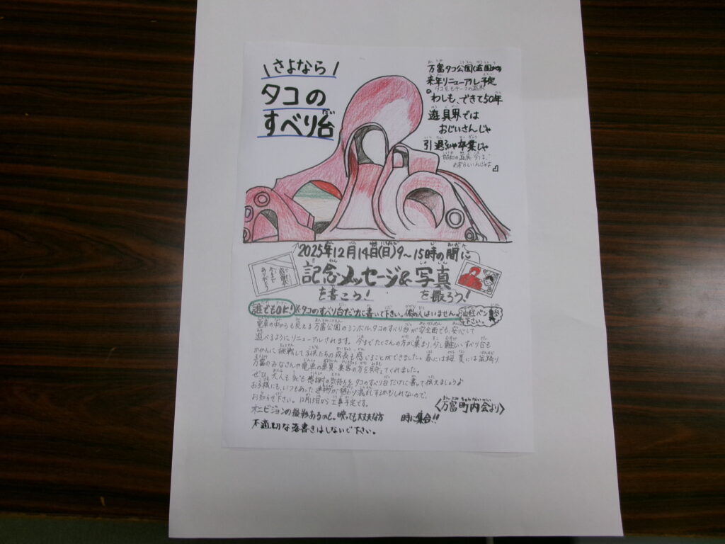 万富町内会では、タコの滑り台とお別れするため、思い出をタコの