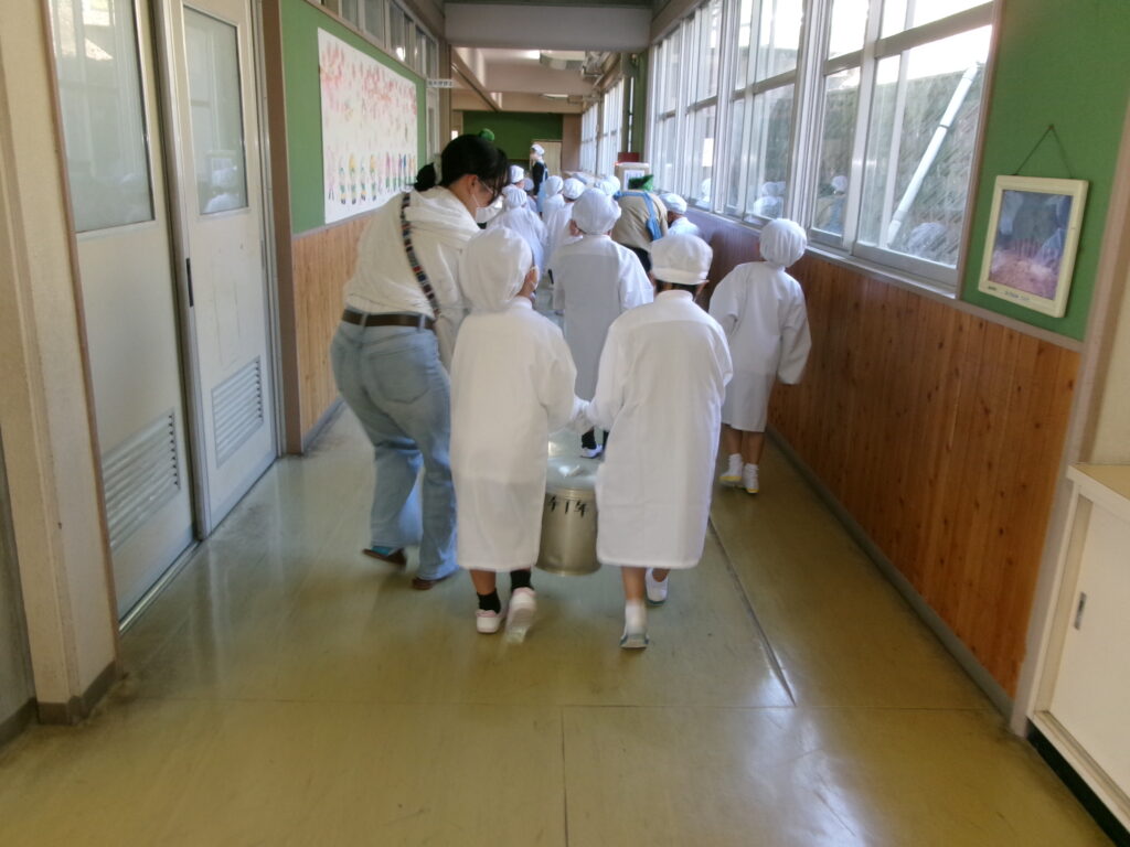 千種小学校へ入学して給食が始まり、自分たちで食器や食材を運ぶ