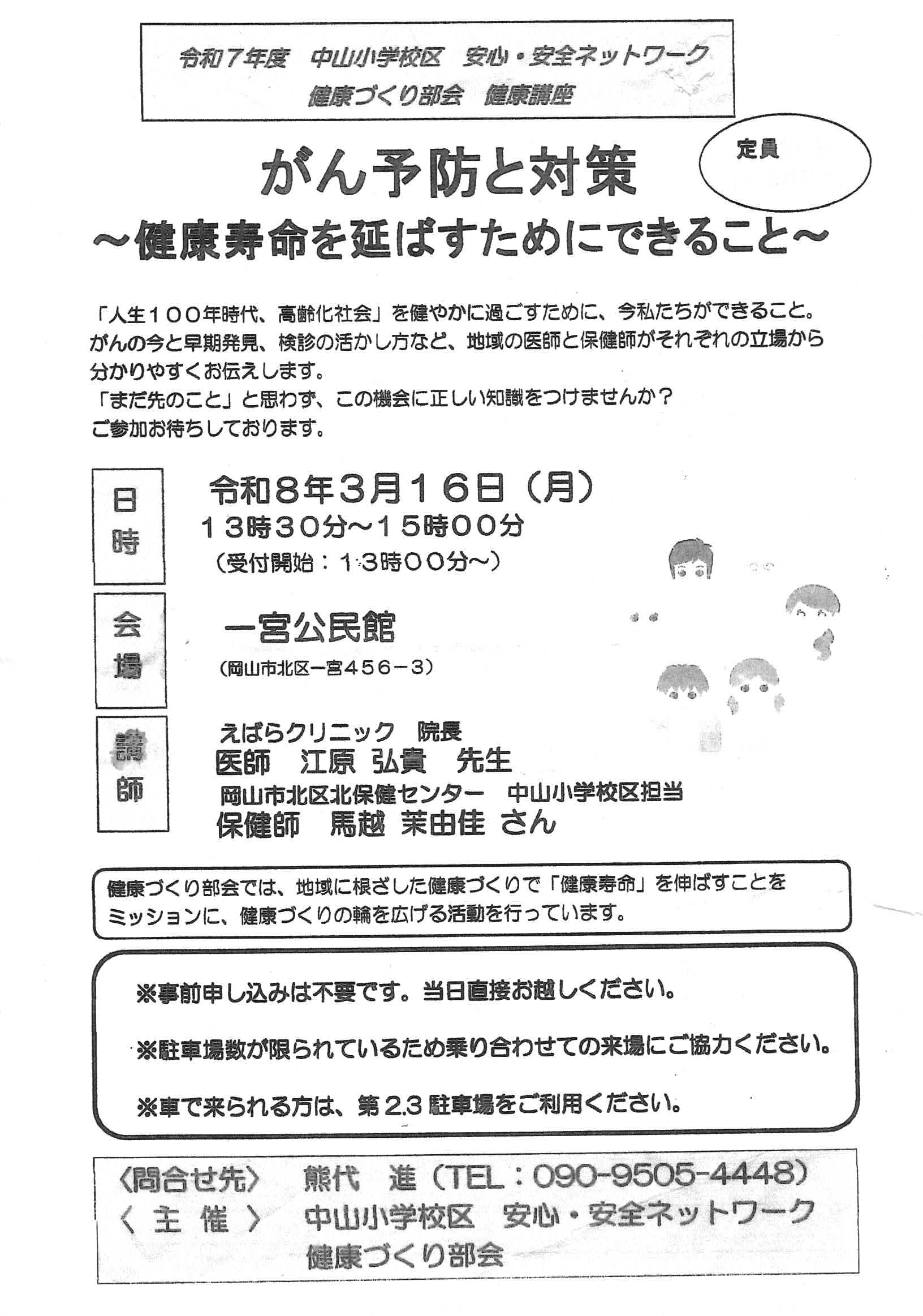 去る3月16日、一宮公民館で中山小学校区安心・安全ネットワーク主催による健康づくり講演会「がん予防と対策~健康寿命を延ばすためにできること~」が開催され、多くの地域住民の皆さまが参加されました。がんは「2人に1人がかかる」と言われる身近な病気。今回は、医師と保健師の専門家から、治療・検診・予防の最新情報を学ぶ貴重な機会となりました。
