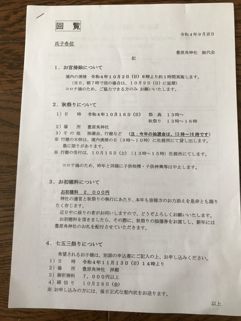2.秋祭りについて 10月16日(日) 祭典には 町内会からは泉谷会長が参加いたします。