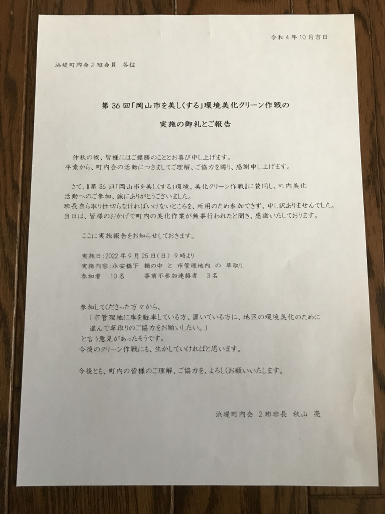 ① 班長・役員の今後の役割や担当者の引継ぎについて、年齢制限や名簿が不鮮明になりつつあり、今後の2班運営に支障をきたす恐れがある。年内に何らかの形でめどをつけておくことが出来れば、町内会事業の継承がスムーズに行えるのではないでしょうか?