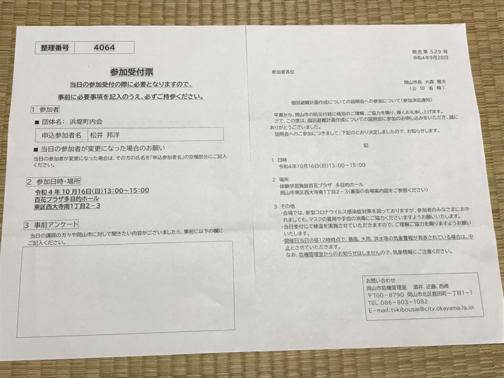 岡山市個別避難計画作成説明会 投稿日:2022年10月5日 岡山市危機管理室による個別避難計画作成説明会が、令和4年10月16日(日)13:00~15:00 体験学習施設百花プラザ多目的ホールでおこなわれます。町内会からは松井が参加いたします。 カテゴリー:自主防災組織