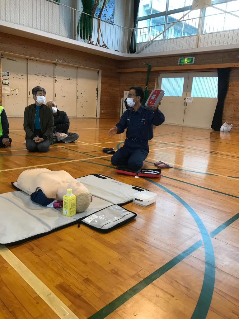 水消火器による初期消火訓練と、胸骨圧迫による心臓活性化体験研修及びAEDの使用方法の説明が行われました。