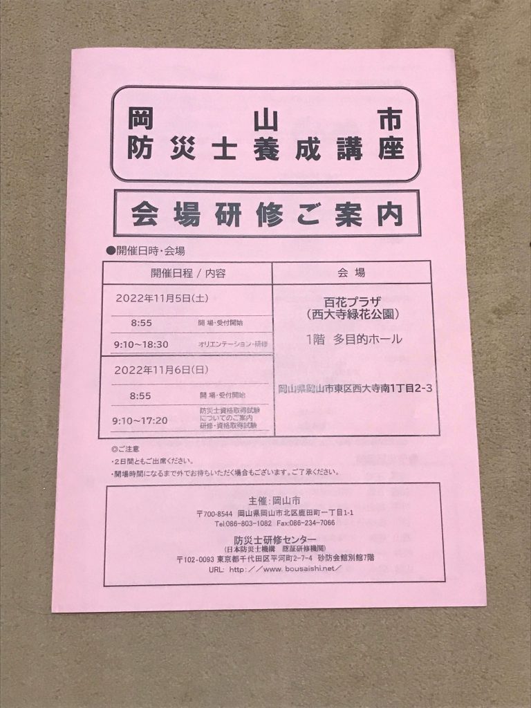 11月5日(土)、6日(日)の二日間の日程で、西大寺百花プラザで岡山市防災士養成講座があり、松井が参加させていただきました。私たちの町の防災の為、何か約に立つことが出来れば、何か恩返しをできないかという思いで日々過ごしていました。思いがけない形で町内会の自主防災会に関わることとなりました。しかし、勉強不足なこともあり、どう話を進めていけば良いのか一人悩んでいました。岡山市危機管理室の酒井様に相談させていただきましたら、防災士の資格を取ることで防災に関する様々な情報、視点を得ることが出来るので何かヒントになるのではないかと、アドバイスをいただきました。そのような流れで、町内会長の泉谷様や豊連合町内会長様のご協力で推薦していただき、受験をすることが出来ました。本当にありがとうございました。今後も日々精進を続け、微力ながら(共助)の町内会・自主防災組織を活性化出来るよう改善し続けていくことが出来ればと思います。