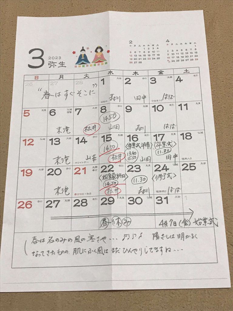 3月安全パトロール当番表 投稿日:2023年3月19日 “春はすぐそこに“ 春花のみの風の寒さや・・・ ♬ ♪ 陽射しは明るくなってきたものの、肌に吹く風はまだひんやりしてますね・・・ カテゴリー:交通安全パトロール 新着情報