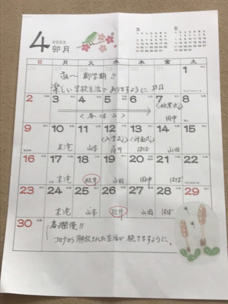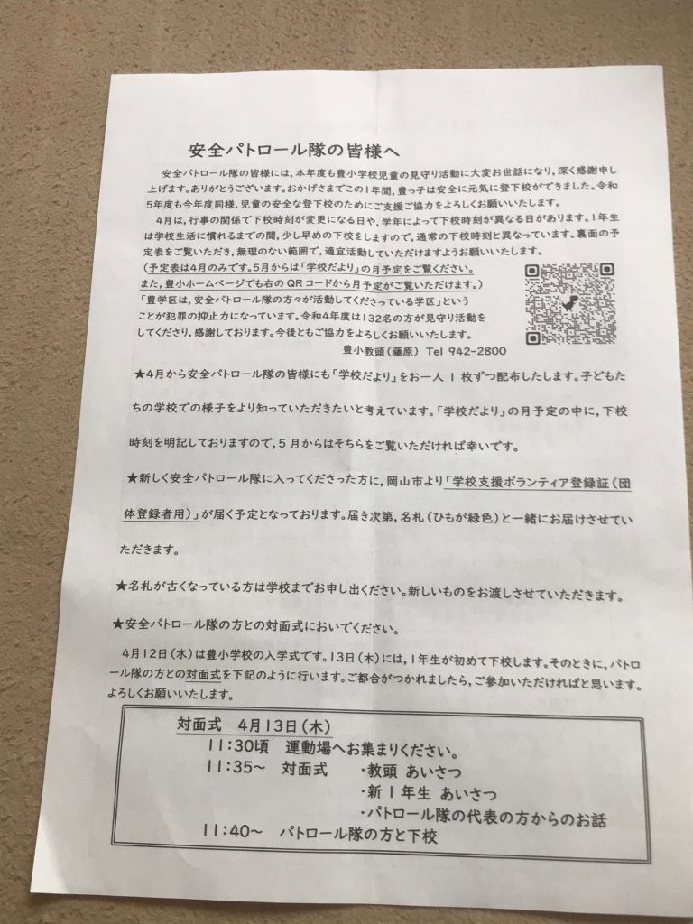 4月交通安全パトロール当番表 投稿日:2023年4月10日 さあ~ 新学期!! 楽しい学校生活でありますように♪♬ 春爛漫!! コロナから解放された生活が続きますように。 カテゴリー:交通安全パトロール 新着情報