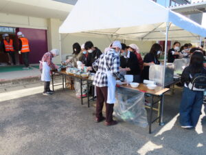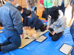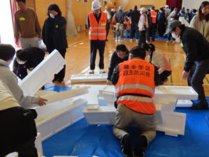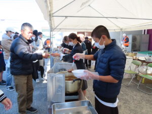 11月23日(月・祭)に幡多学区の平成7年度防災訓練を幡多小学校体育館で実施されました。各町内会から参加有志を募り約150人と竜操消防署・町内会長・婦人会・中学生など約100人が指導とお手伝いで参加しました。テント、簡易ベット、簡易トイレの組立、AED(救命救護)訓練、VR体験等々の体験型訓練が行われ、体育館の外では婦人部による炊出し訓練で中学生がお手伝いをしてカレーライスが振舞われました。