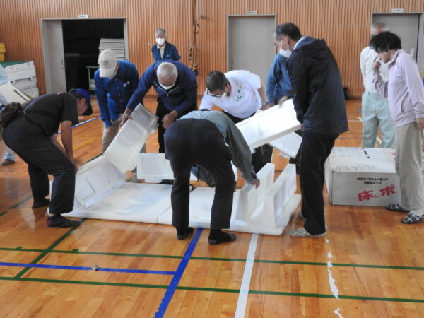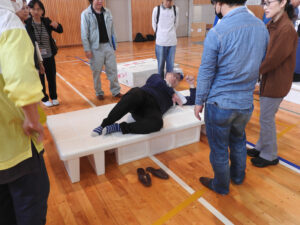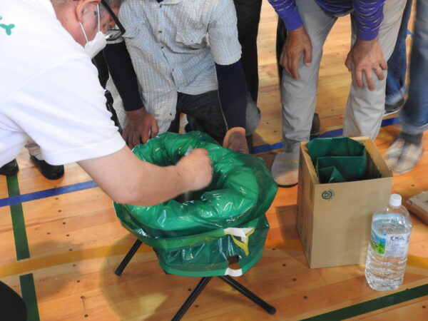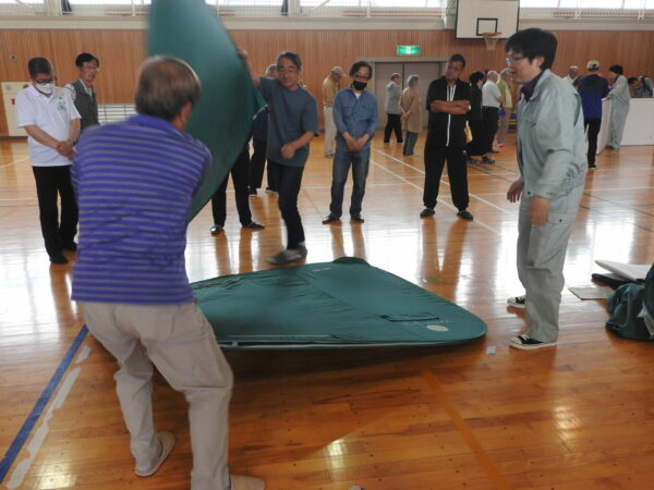 「簡易ベットは思ったより簡単に組み立てられる」「この簡易トイレはいくらぐらいで市販してるの」「マンホールトイレはどこに設置していますか」。避難用具の組み立てに取り組みながら、参加者から質問が次々に投げかけられる。