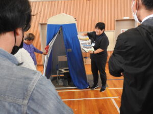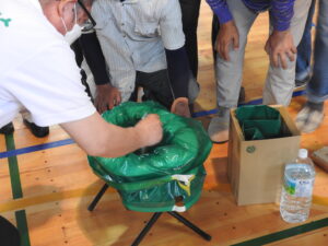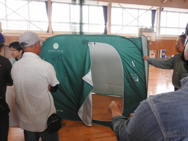 その後、参加者は3グループに分かれて、簡易トイレ、テント、簡易ベッドの組み立て体験実習に挑戦しました。