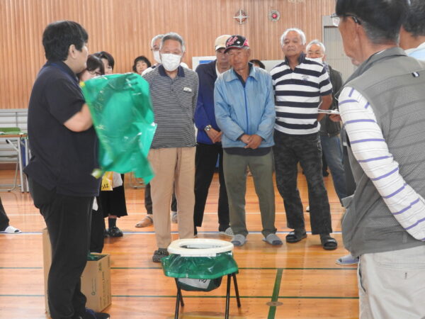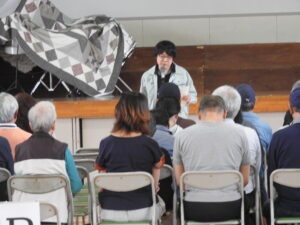 開会挨拶、来賓挨拶に続き、岡山市危機管理室防災企画担当の八木貴之さんが「避難所生活で使用する避難用具を会場に用意しました。避難所の開設・運営には地域住民の協力が欠かせません。この機会に避難用具の使い方を学んでください」と講演。