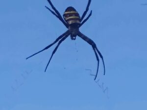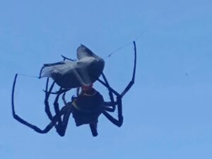 女郎クモの捕食 投稿日:2025年9月24日 コガネ虫を捕らえる 足を広げると12㎝近い巨大な女郎クモが巣にかかったコガネ虫を捕らえる瞬間を私の畑の中で写しました。 凄い早業で、コガネ虫は、アッと言う間にクモがお尻から出す複数の幅広い糸で、まるでサランラップか白いサラシで、巻かれたよう白い塊になってしまいました。 (平井7丁目 2025年9月 撮影 須賀町内会 広報委員 投稿) カテゴリー:行事