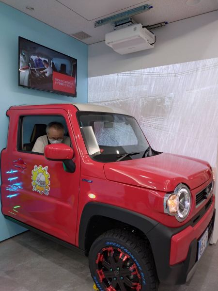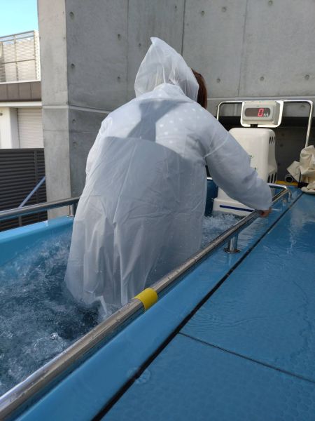 参加者は貸切バスで同センターにむかい、数グループに分かれて、流水歩行体験・風雨体験・水圧自動車ドア体験・水圧ドア体験・展示物と映像学習を体験しました。