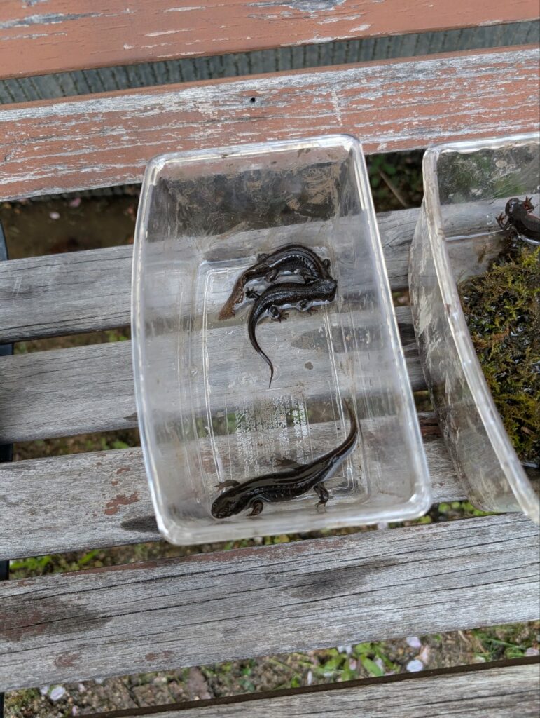 スイスの研究機関との合同研究で研究用のセトウチサンショウウオ生体が必要になったため、4月17日午後、岡山理科大恐竜学科のH先生と研究室の方々が、岡山市生き物の里にも登録されている母谷の生息地を訪れました。現地に案内し、研究用の生体採取に協力いたしました。見つかった生体や卵蘘の中から、雌を含む生体3匹と卵蘘2房を持ち帰り、残りは元に戻してもらいました。生き物の進化に関する研究のようで、研究が進み、人類にも役立つ成果が出ることを期待しています。