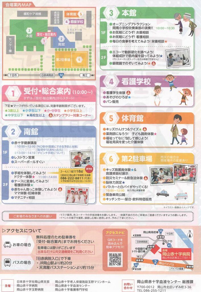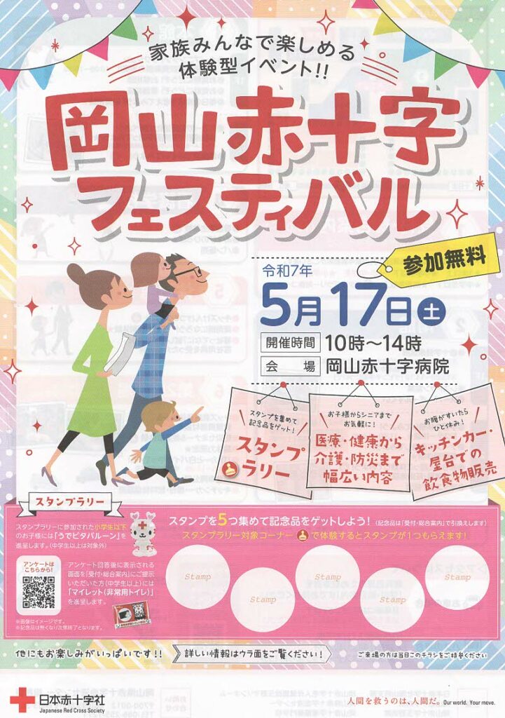 「岡山赤十字フェスティバル」 投稿日:2025年4月24日 北区役所で見つけたパンフの紹介です。5月17日(土)10時~14時まで岡山赤十字病院で「岡山赤十字フェスティバル」が開催されます。主催は日本赤十字社岡山県支部他です、料金は無料です。お子様のある家族は是非とも参加して下さればと思います。出来るだけ公共交通機関での来場をお願いいたします。 岡山赤十字フェスティバル 詳細は以下で イベント詳細 ツイート カテゴリー:電子町内会