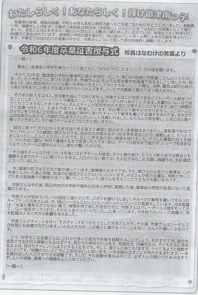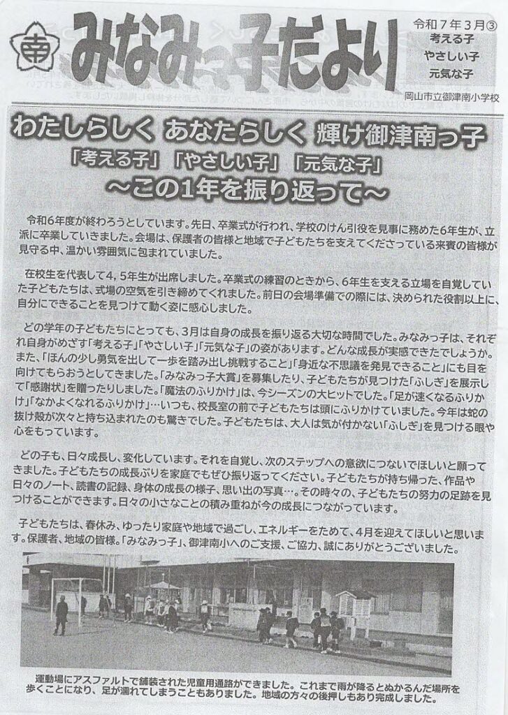 みなみっ子だより3月号-3を掲載いたします。『考える子』、『やさしい子』、『元気な子』〜この一年を振り返って〜、『令和6年度卒業証書授与式』〜校長はなむけの言葉より〜(岡山シーガルズの河本監督を育てた「市原誠二」第10代御津南小学校長の話)です。