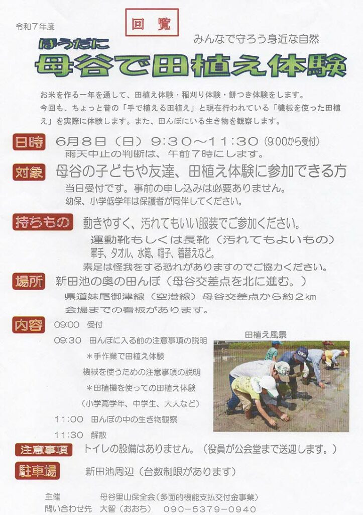 母谷で田植え体験(回覧) 投稿日:2025年5月20日 「手で植える田植え」と「機械を使った田植え」を実際に体験しそこにいる生き物を観察します。令和7年6月8日(日)午前9時30分~11時30分 たくさんの方々の参加をお待ちしております。 詳しくは 下記回覧 をご覧ください。 母谷で田植え体験 ツイート カテゴリー:自治会 里山保全会