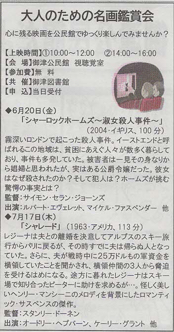 6、7月のおすすめ御津公民館講座その2は「大人のための名画鑑賞会」です。6月20日(金)10時~、14時~の2回上映されるのはイギリスの名作「シャーロックホームス〜淑女殺人事件〜」です。ホームズと一緒に推理に挑戦下さい。7月17日(木)10時~、14時の2回上映されるのはアメリカの「シャレード」です。オードリー・ヘップバーン主演のロマンティックサスペンスをヘンリーマンシーニの名曲でどうぞ。
