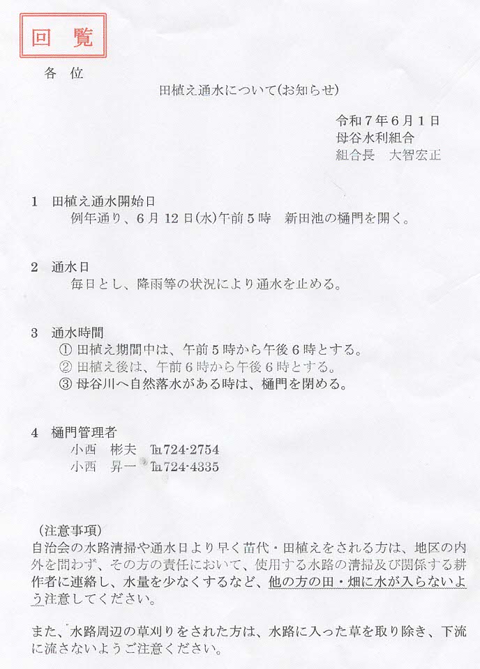 田植え通水について(回覧) 投稿日:2025年6月8日 田植え通水開始日令和7年6月12日(日)午前5時 新田池の樋門を開く。詳しくは 下記回覧 をご覧ください。 田植え通水2025 ツイート カテゴリー:里山保全会
