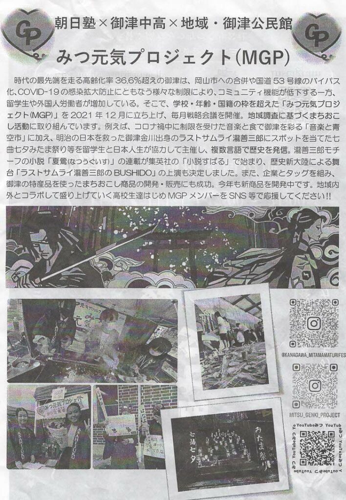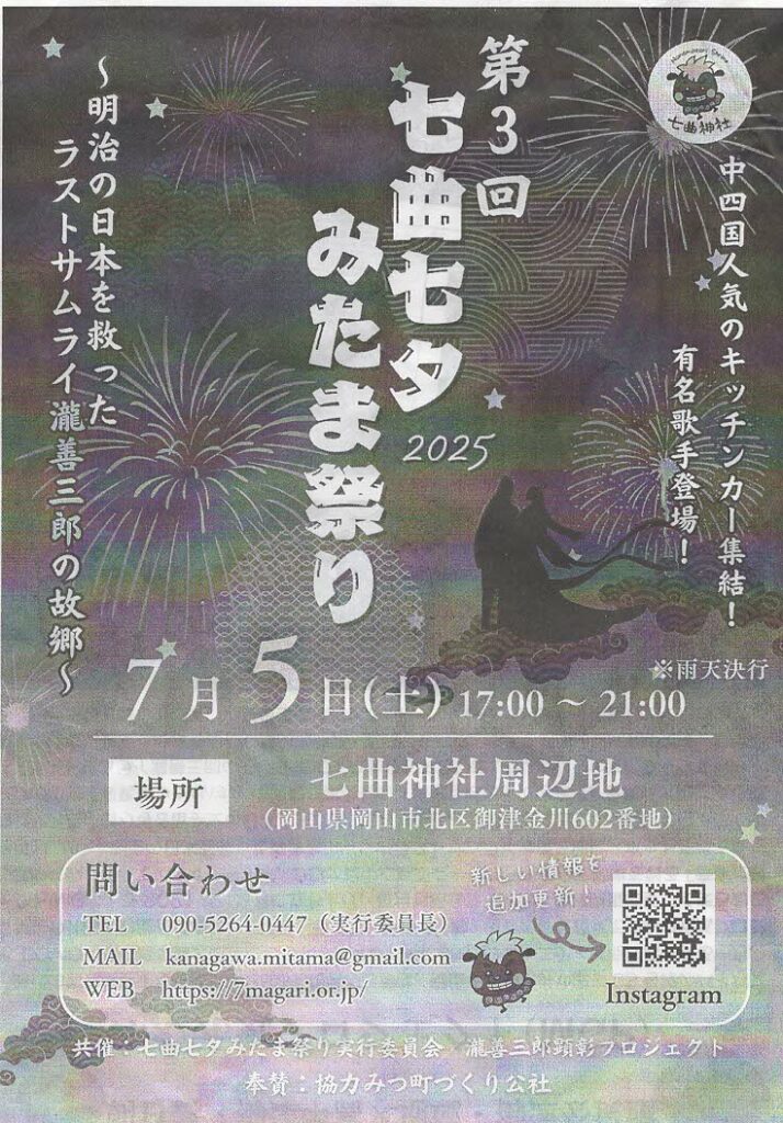 七曲七夕みたま祭りは明治の日本を救った御津金川出身のラストサムライ滝善三郎のスポットを当てて始まったイベントです。企画してくれている「みつ元気プロジェクト(MGP)」のパンフレットも是非お読み下さい。