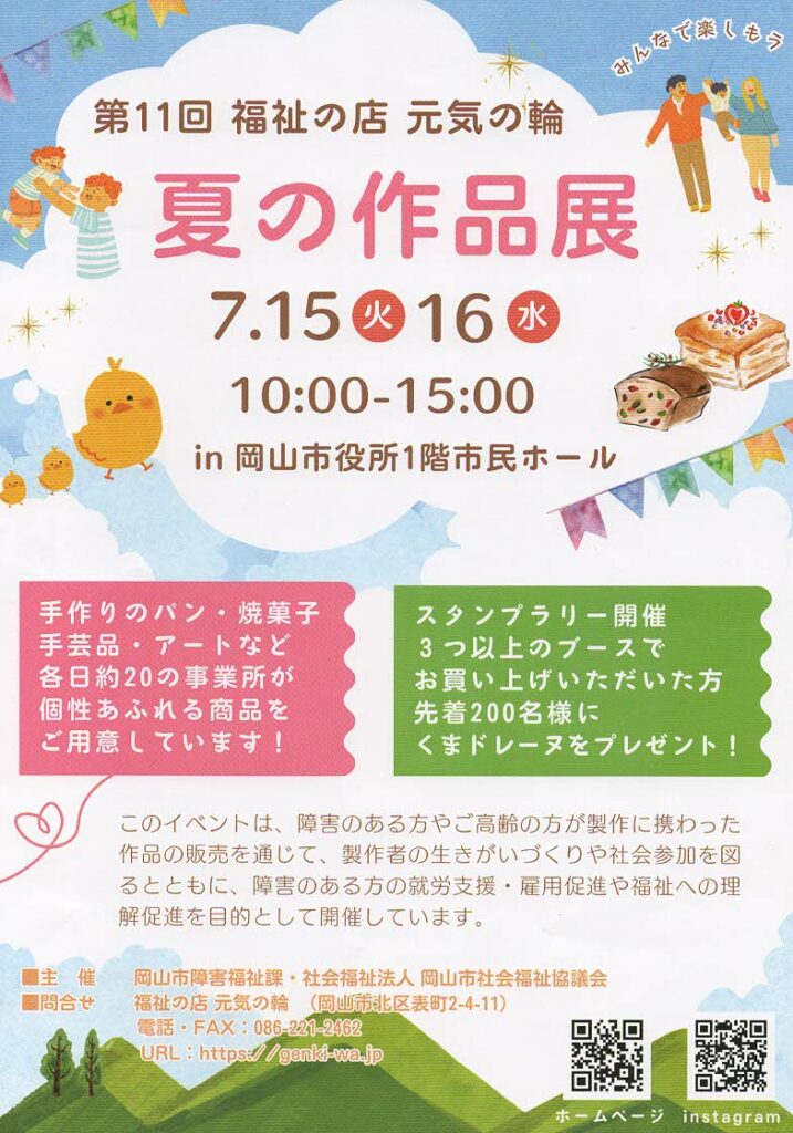 津高公民館で見つけたパンフの紹介です。第11回福祉の店元気の輪「夏の作品展」が7月15日(火)と16日(水)の10時~15時に岡山市役所1階市民ホールで開催されます。このイベントは、障害のある方やご高齢の方が製作に携わった作品の販売を通じて、製作者の生きがい作りや社会参加を図るとともに、障害のある方の就労支援・雇用促進や福祉への理解促進を目的として開催しています。お気軽にご参加願います