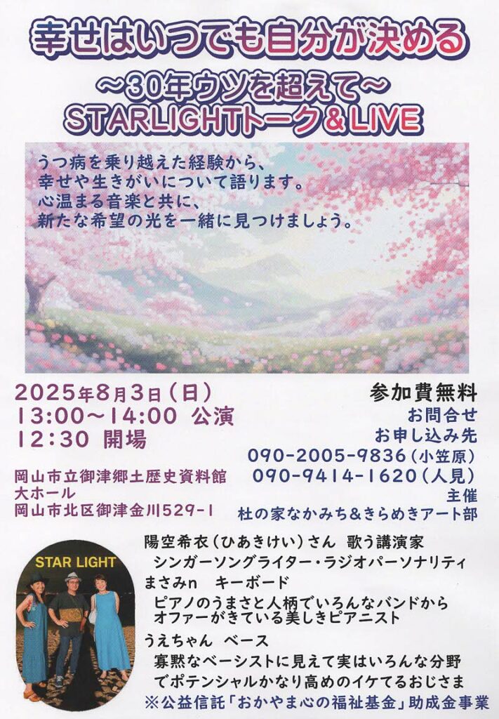 「幸せはいつでも自分が決める〜30年ウツを超えて〜」 投稿日:2025年6月27日 杜の家なかみち&きらめきアート部が主催するトーク&ライブの紹介です。 「幸せはいつでも自分が決める〜30年ウツを超えて STARLIGHHTトーク&LIVE」が8月3日(日)13時から、御津郷土歴史資料館大ホールで公演されます。この活動は公益信託「おかやま心の福祉基金」の助成金事業で開催され、参加費は無料です。心温まる音楽を楽しみましょう。申込みは杜の家なかみちの「小笠原さん」か、きらめきアート部の「人見さん」まで。 詳細は以下で 「幸せはいつでも自分が決める」 ツイート カテゴリー:電子町内会