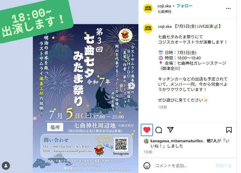 Kanagawa_mitamamaturifesのinstagramで見つけた情報の紹介です。「第3回七曲七夕みたま祭り」が明日金川の七曲神社で7月5日(土)に開催されます。今年も高校生が中心となって企画してくれています。今回の天気は天晴れに間違いなさそうです。良かったです。発表時に有名歌手と紹介されていたのは東京スカパラオーケストラのコピーバンドとして岡山で活躍しているコジスカオーケストラのようです。演奏は18時からです。お楽しみに!