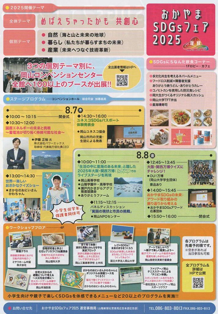 津高公民館で見つけたパンフの紹介です。8月7日(木)、8日(金)10時から「おかやまSDGsフェア」がおかやまコンベンションセンター(岡山市北区駅元町14番1号)で開催されます。全館へ100以上のブースが出展されます。ご興味のある方は是非ご覧ください。