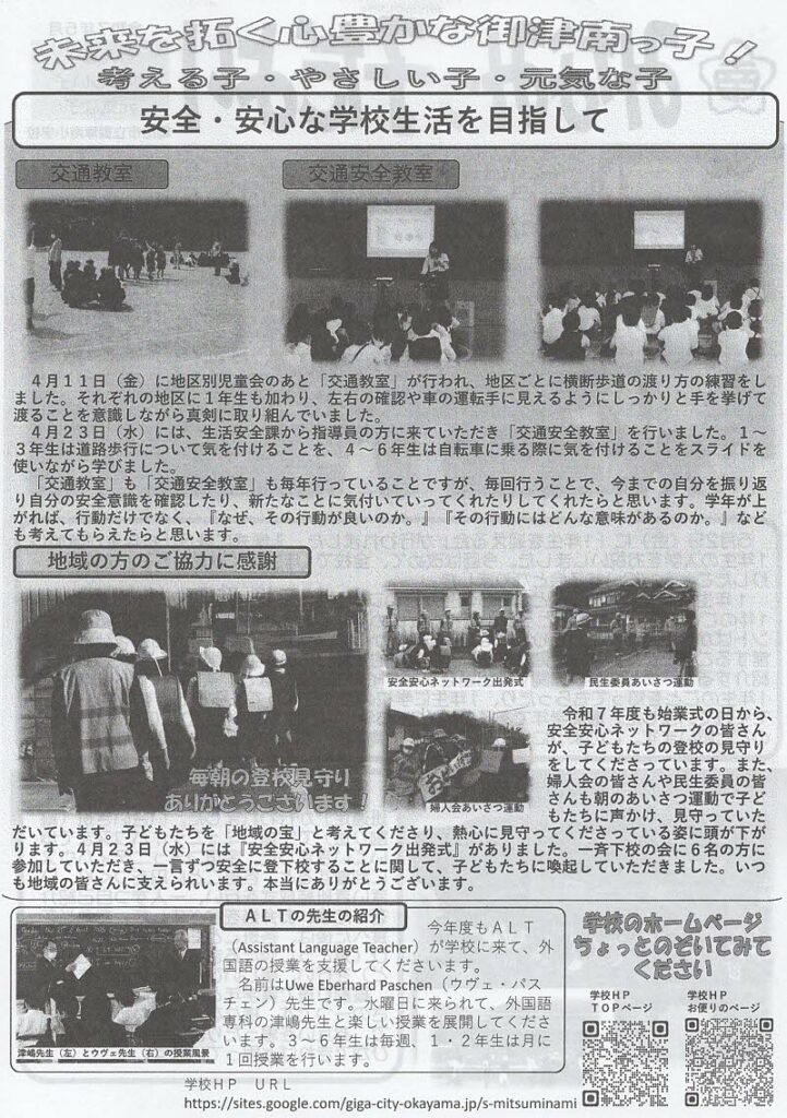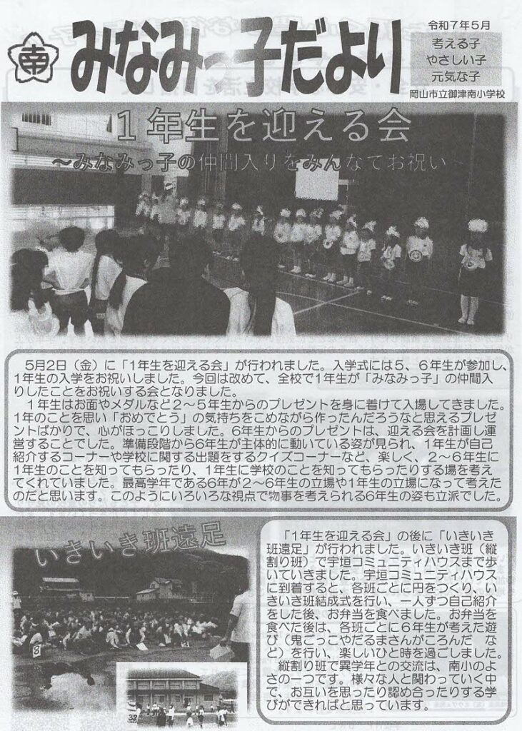 みなみっ子だより5月号を掲載いたします。『1年生を迎える会』〜みなみっ子の仲間入りをみんなでお祝い、『いきいき班遠足』、『安全・安心な学校生活を目指して』、『地域の方のご協力に感謝』、『ALTの先生の紹介』です。