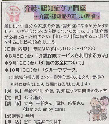 8、9、10月のおすすめ御津公民館講座は「介護・認知症ケア講座」〜介護・認知症の正しい理解〜です。8月8日(金)、9月12日(金)、10月10日(金)10時~12時に開催されます。8月は「介護保険サービスを利用する方法」、9月は「介護のお金について」です。申込みは窓口・電話で。参加無料です。