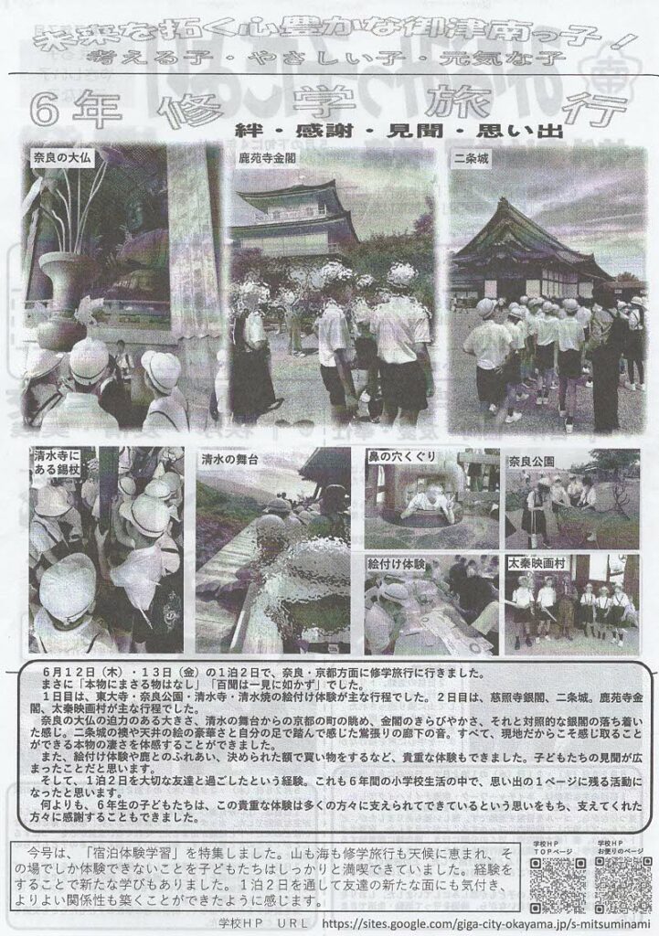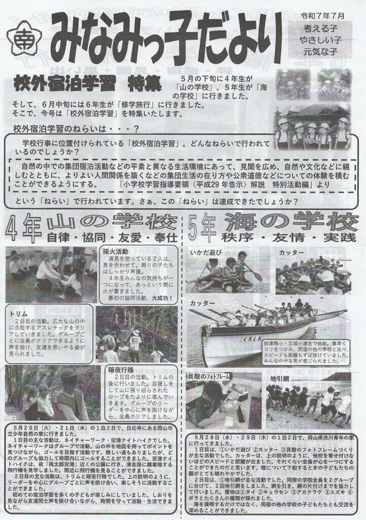 みなみっ子だより7月号-1を掲載いたします。『校外宿泊学習』、4年 山の学校(少年自然の家)、5年海の学校(渋川青年の家)、6年 修学旅行(奈良・京都)です。