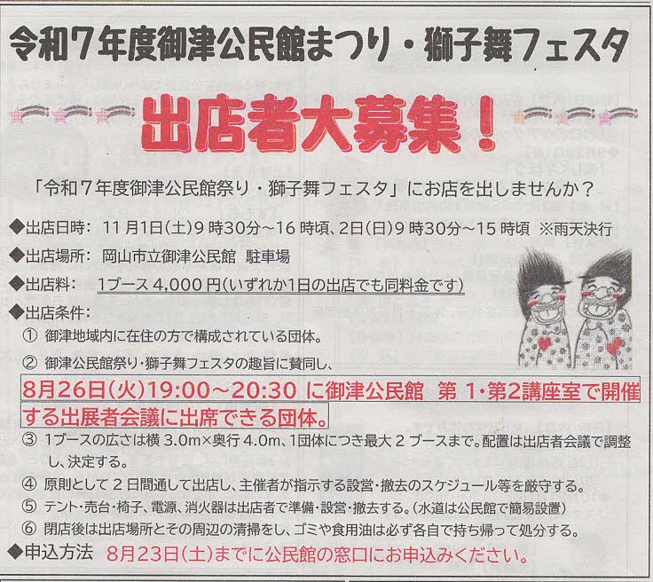 「令和7年度御津公民館まつり・獅子舞フェスタ」〜〜出店者大募集!〜〜 投稿日:2025年8月10日 御津公民館だよりからの紹介です。11月1日(土)、2日(日)に「令和7年度御津公民館まつり・獅子舞フェスタ」が開催されます。そのイベントでの〜〜出店者大募集!〜〜です。出店を希望される方は8月23日までに公民館の窓口に申し込み願います。 詳細は以下で 獅子舞フェスタ出店者募集 ツイート カテゴリー:地域ニュース