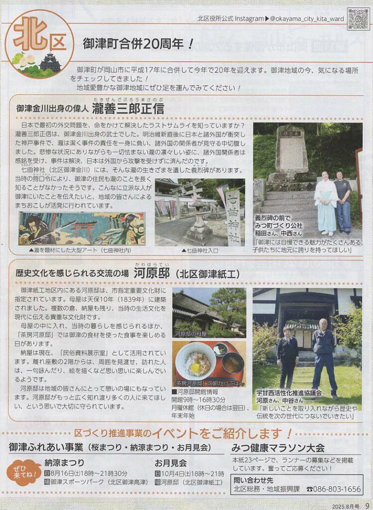 「御津町合併20周年!」 投稿日:2025年8月12日 市民のひろばおかやま8月号に載っていた記事の紹介です。北区の記事に「御津町合併20周年!」で御津金川出身の偉人「滝善三郎正信」、歴史文化を感じられる交流の場「河原邸」、御津ふれあい事業「納涼まつり」、「お月見会」、「みつ健康マラソン」の記事が掲載されています。自然豊かな御津地域にぜひ足を運んで下さい。納涼まつりは8月16日18時から御津スポーツパークで! 詳細は以下で 御津町合併20周年! ツイート カテゴリー:地域ニュース