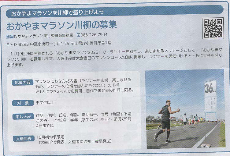 「おかやまマラソン川柳募集」2025 投稿日:2025年8月18日 市民の広場8月号からの紹介です。今年もおかやまマラソンの川柳を募集しています。応募資格は小学生以上、応募方法は大会公式QRコードまたはハガキからになります。入選作品は、コース沿道に掲示されます。締め切りは9月4日までなので、川柳好きの方は是非応募をお願いいたします。 詳細は以下で おかやまマラソン川柳2025 ツイート カテゴリー:電子町内会
