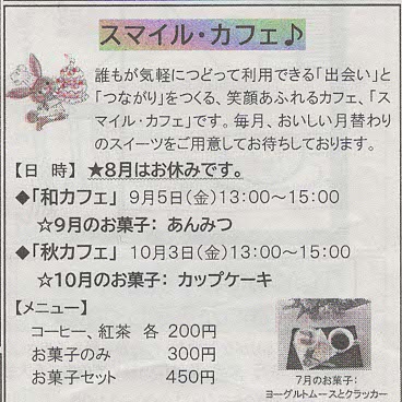 9、10月のおすすめ御津公民館講座その1は「和カフェ」、「秋カフェ」です。9月5日(金)13時~15時と10月3日(金)13時~15時に開催されます。9月のお菓子はあんみつ、10月はカップケーキです。笑顔あふれるスマイルカフェにお越しください。