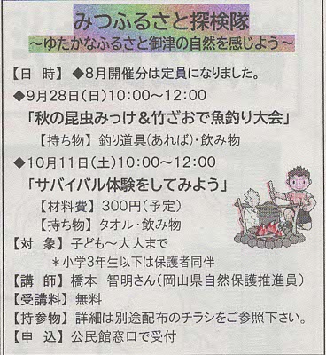 9、10月のおすすめ御津公民館講座その2は「みつふるさと探検隊」です。9月28日(日)10時~12時と10月11日(土)10時~12時に開催されます。9月は「秋の昆虫みっけ&竹ざおで魚釣り大会」、10月は「サバイバル体験をしてみよう」です。御津の自然を是非ご体験ください。