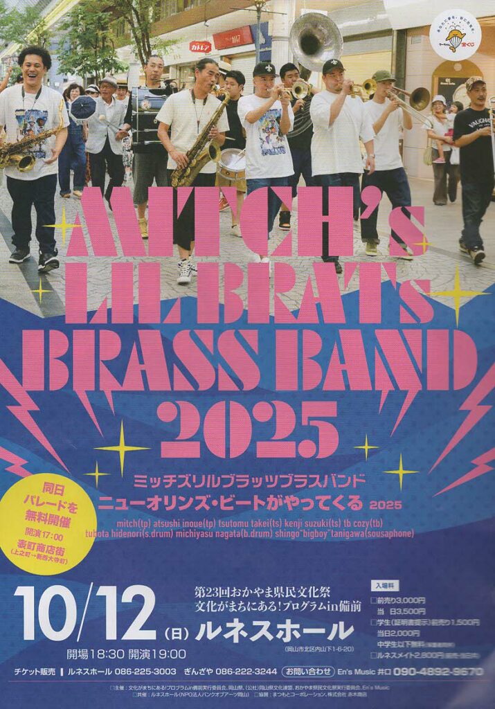 「MITCH’s LILBRAT’s BRASS BAND」2025が10月12(日)19時からルネスホールで開催されます。入場料は3500円です。日本におけるニューオリンズブラスバンドのパイオニアである「ミッチズリルブラッツブラスバンド」の演奏をお楽しみください。17時から表町商店街で無料のパレードもあります。