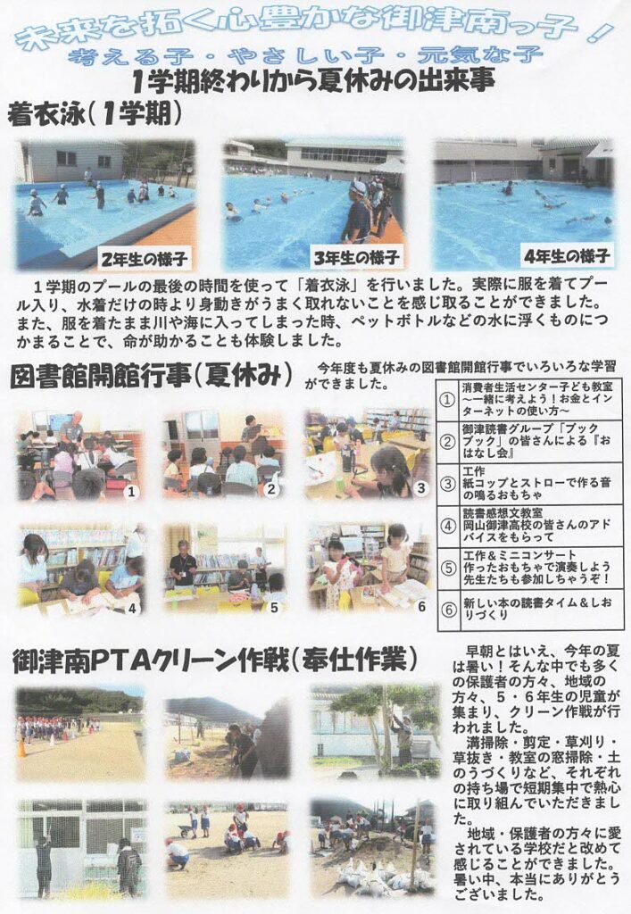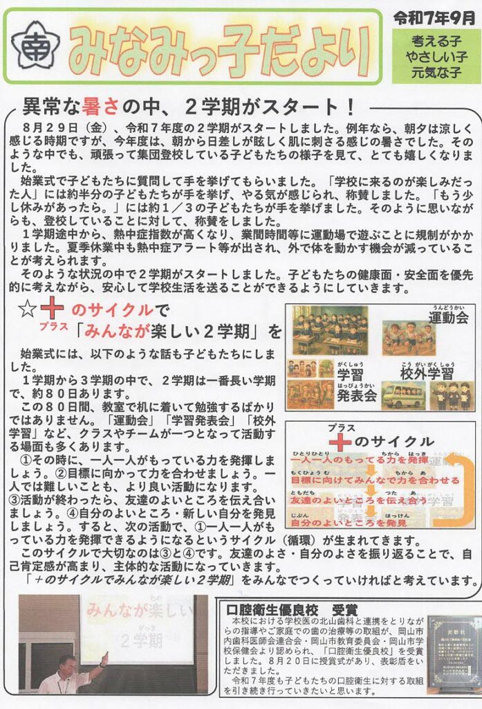 みなみっ子だより9月号(回覧) 投稿日:2025年9月17日 みなみっ子だより9月号を掲載いたします。『異常な暑さの中、2学期がスタート!』、『口腔衛生優良校 受賞』、『1学期終わりから夏休みの出来事』、着衣泳(1学期)、図書館開館行事(夏休み)、御津南PTAクリーン作戦(奉仕作業)です。 是非お読みください みなみっ子だより9月号 ツイート カテゴリー:自治会