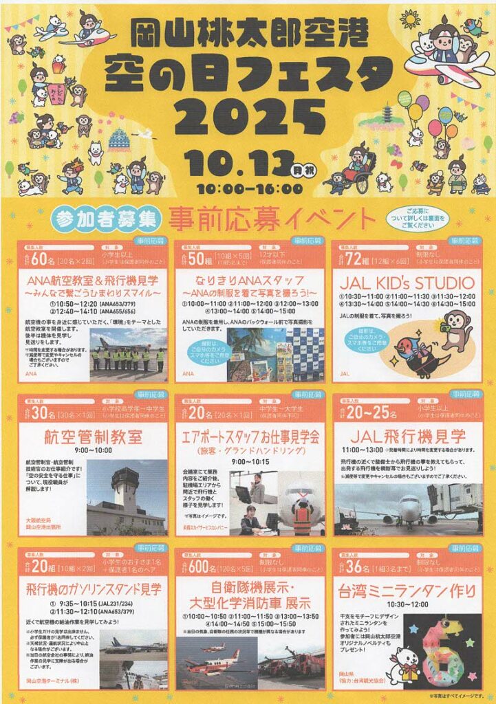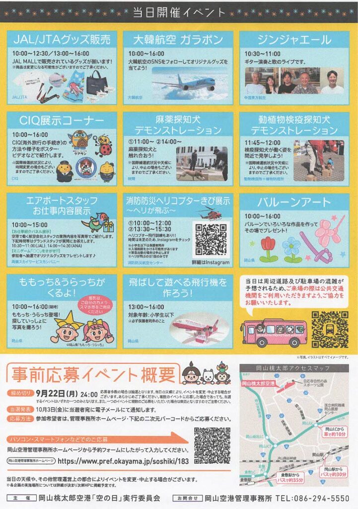 当日は様々なイベントが実施されますので、皆様お誘い合わせのうえ、ぜひ岡山桃太郎空港へお越しください。