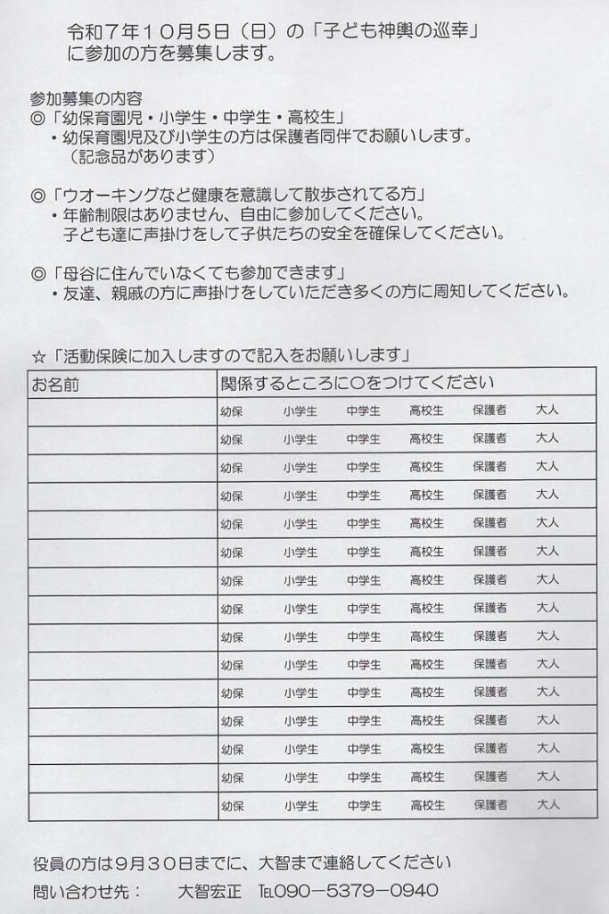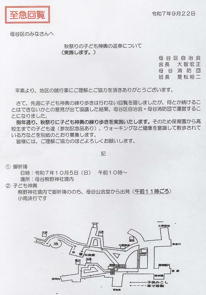 さて、先週に子ども神輿の練り歩きは行わない回覧を廻しましたが、何とか続けることは出来ないかとの意見が出て協議した結果、母谷区自治会・母谷消防団で運営することになりました。例年通り、秋祭りに子ども神輿の練り歩きを実施いたします。そのため保育園から高校生までの子ども達(参加記念品あり)、ウォーキングなど健康を意識して散歩されている方などを募集いたします。
