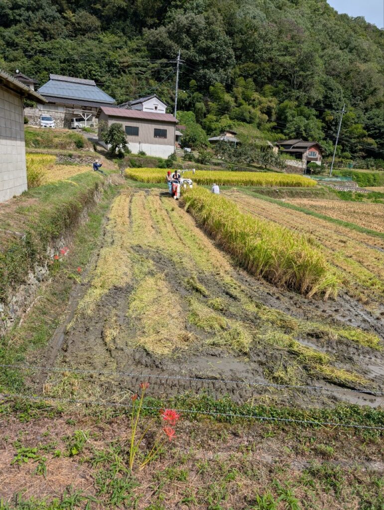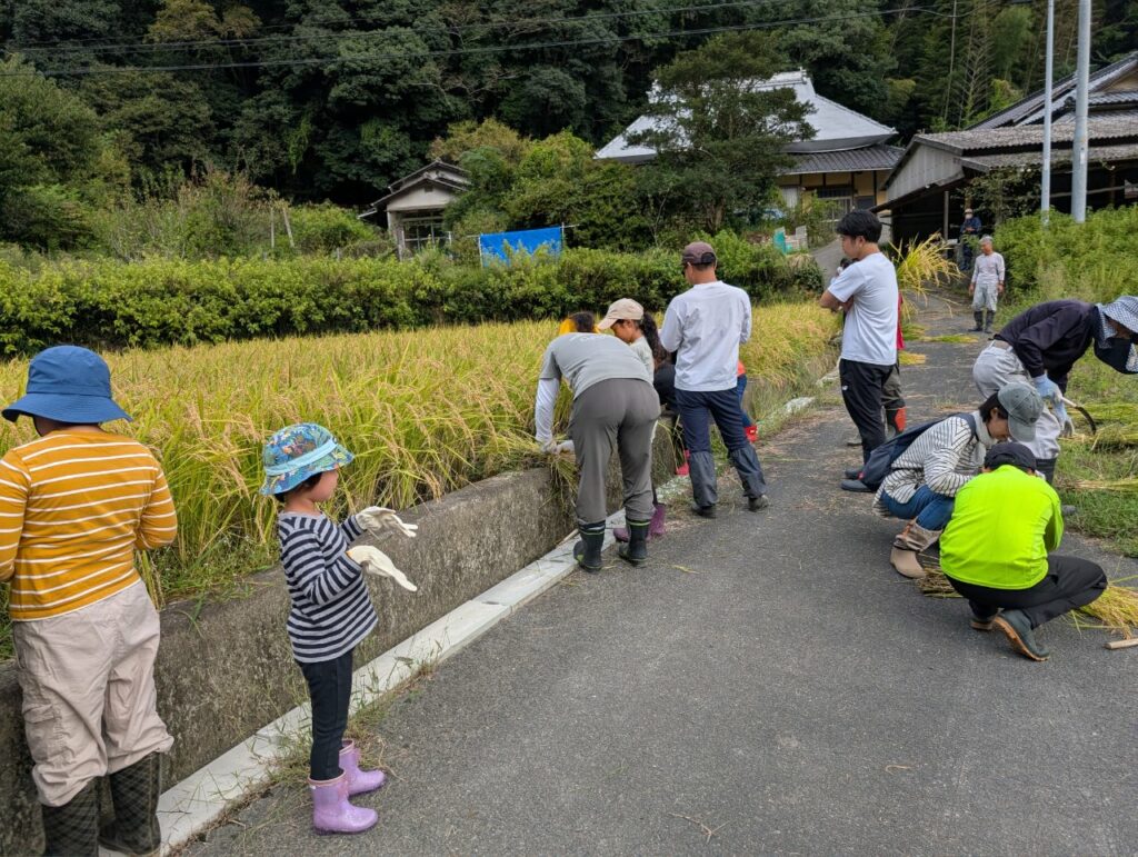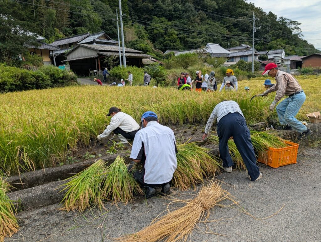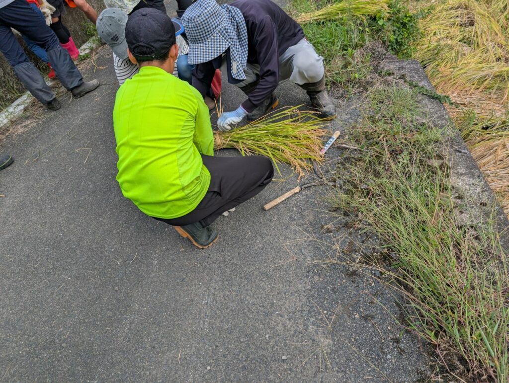 9月27日(土)9:30から母谷で稲刈り体験を38名が参加して開催しました。今年は天気に恵まれ、岡山市内の家族11名も参加してくれました。岡山理科大も先生を含む14名、地元の役員も含め38名もの参加となりました。昔の鎌で刈る稲刈り、現在のコンバインでの稲刈りを体験してもらいました。子ども達は昔の稲刈りでは鎌の使い方や、藁で束ねる作業に四苦八苦していましたが、コンバインは楽しそうに運転してくれました。先生役の副会長、神主様お疲れ様でした。学生達も川や田んぼの生き物をたくさん捕まえ、子ども達に説明してくれたと思います。理大の学生さん達本当にありがとうございました。役員の皆様もお疲れ様でした。10月の生き物調査と芋掘り、12月の餅つき体験も参加をお待ちしています。