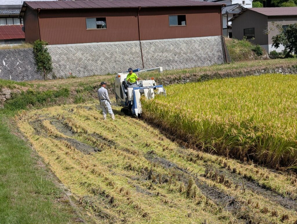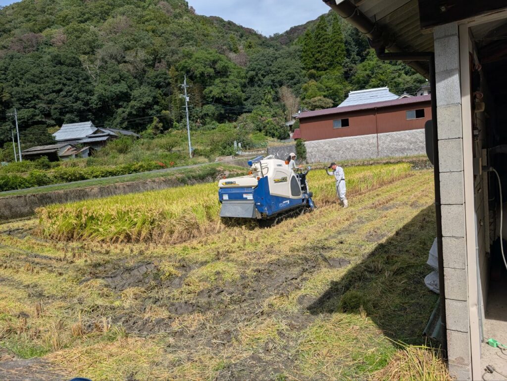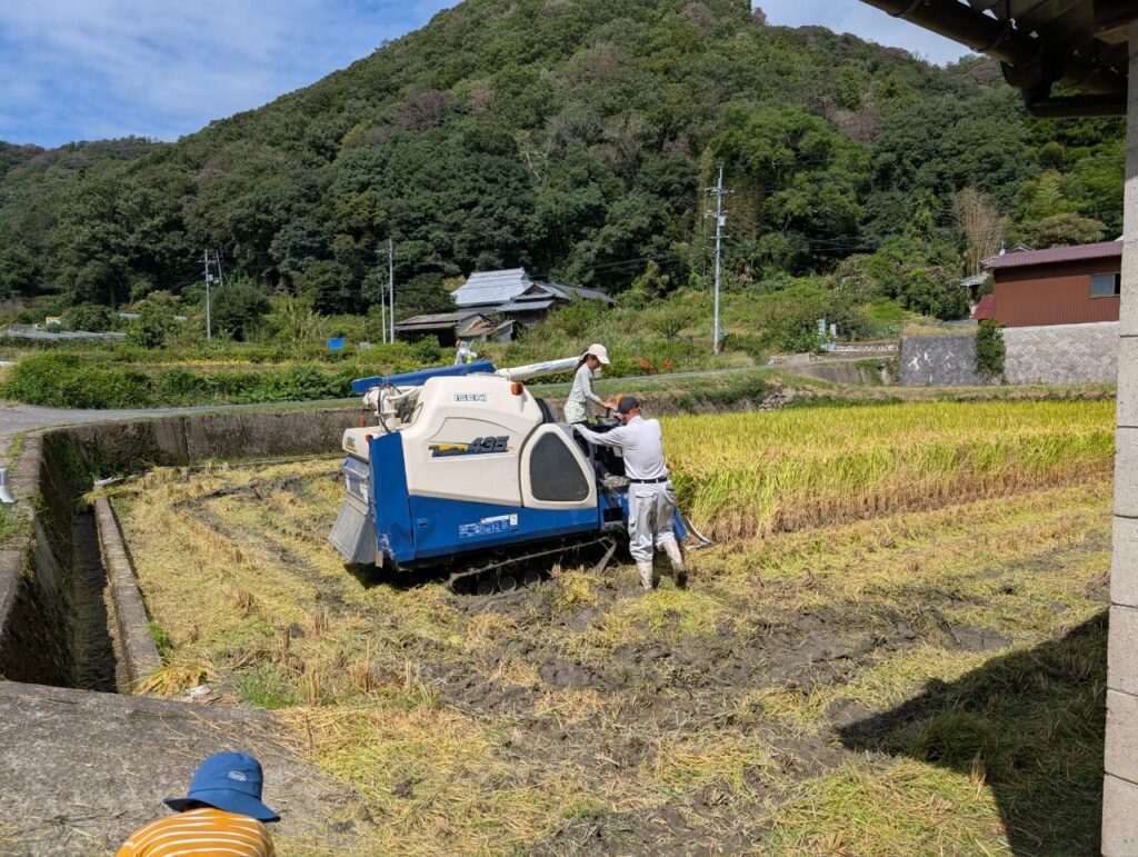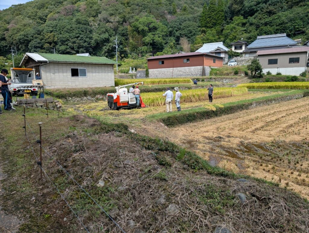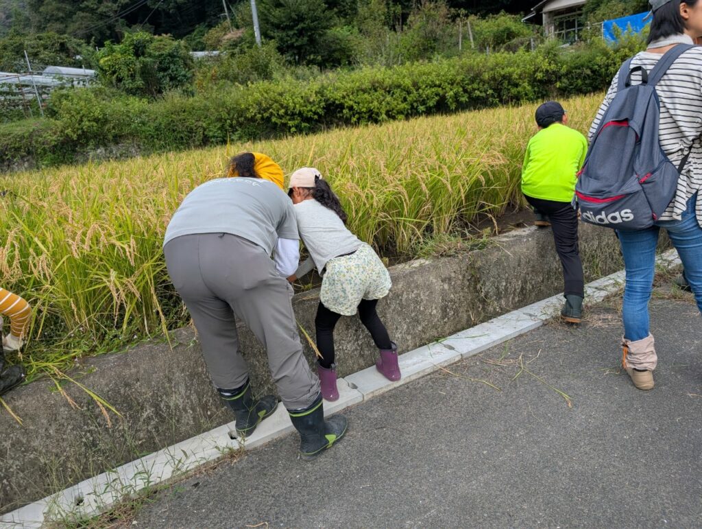 9月27日(土)9:30から母谷で稲刈り体験を38名が参加して開催しました。今年は天気に恵まれ、岡山市内の家族11名も参加してくれました。岡山理科大も先生を含む14名、地元の役員も含め38名もの参加となりました。昔の鎌で刈る稲刈り、現在のコンバインでの稲刈りを体験してもらいました。子ども達は昔の稲刈りでは鎌の使い方や、藁で束ねる作業に四苦八苦していましたが、コンバインは楽しそうに運転してくれました。先生役の副会長、神主様お疲れ様でした。学生達も川や田んぼの生き物をたくさん捕まえ、子ども達に説明してくれたと思います。理大の学生さん達本当にありがとうございました。役員の皆様もお疲れ様でした。10月の生き物調査と芋掘り、12月の餅つき体験も参加をお待ちしています。